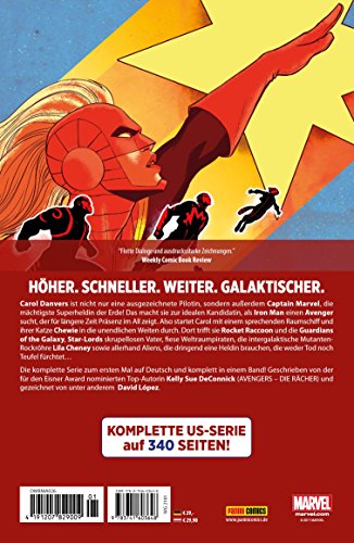 Carol Danvers ist nicht nur eine ausgezeichnete Pilotin, sondern außerdem Captain Marvel, die mächtigste Superheldin der Erde! Das macht sie zur idealen Kandidatin, als Iron Man einen Avenger sucht, der für längere Zeit Präsenz im All zeigt. Also startet Carol mit einem sprechenden Raumschiff und ihrer Katze Chewie in die unendlichen Weiten durch. Dort trifft sie Rocket Raccoon und die Guardians of the Galaxy, Star-Lords skrupellosen Vater, fiese Weltraumpiraten, die intergalaktische Mutanten- Rockröhre Lila Cheney sowie allerhand Aliens, die dringend eine Heldin brauchen, die weder Tod noch Teufel fürchtet…