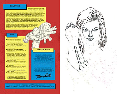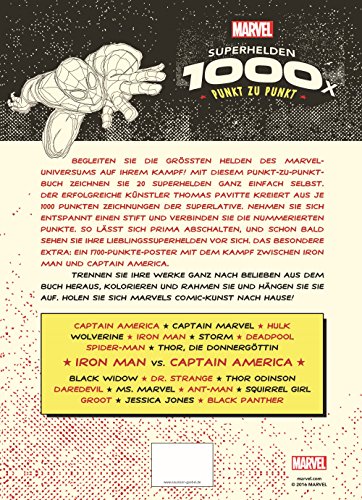 Begleiten Sie die größten Helden des Marvel-Universums auf Ihrem Kampf! Mit diesem Super-Punkt-zu-Punkt-Buch des erfolgreichen Künstlers Thomas Pavitte können Sie 20 Superhelden ganz einfach selber zeichnen. Nehmen Sie sich entspannt einen Stift und verbinden Sie die nummerierten Punkte. So lässt sich prima abschalten und schon bald sehen Sie Ihre Lieblingssuperhelden vor sich. Nun können Sie Ihre Werke noch ganz nach Belieben aus dem Buch heraustrennen, kolorieren, rahmen, um sie aufzuhängen.Es gibt viele Möglichkeiten, Ihre Comic-Superhelden zu vervollständigen, holen Sie sich Marvels Comic-Kunst nach Hause! Das besondere Extra: Ein Poster des Kampfes zwischen Iron Man und Captain America.