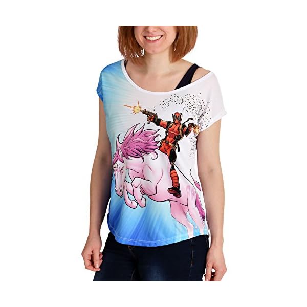 Deadpool Damen T-Shirt Unicorn Ride Loose Fit Marvel Weiß Blau